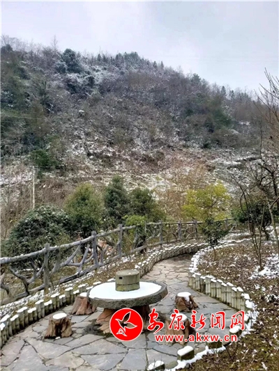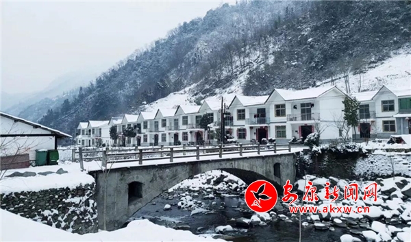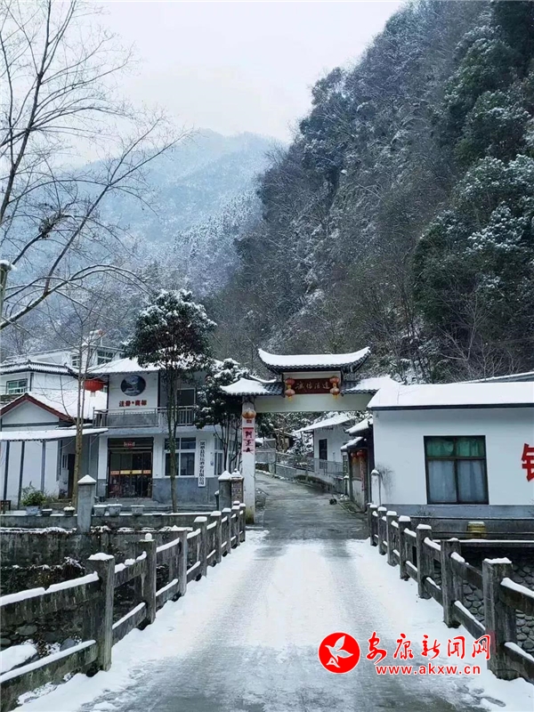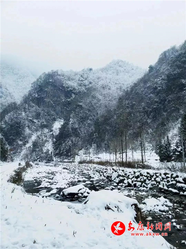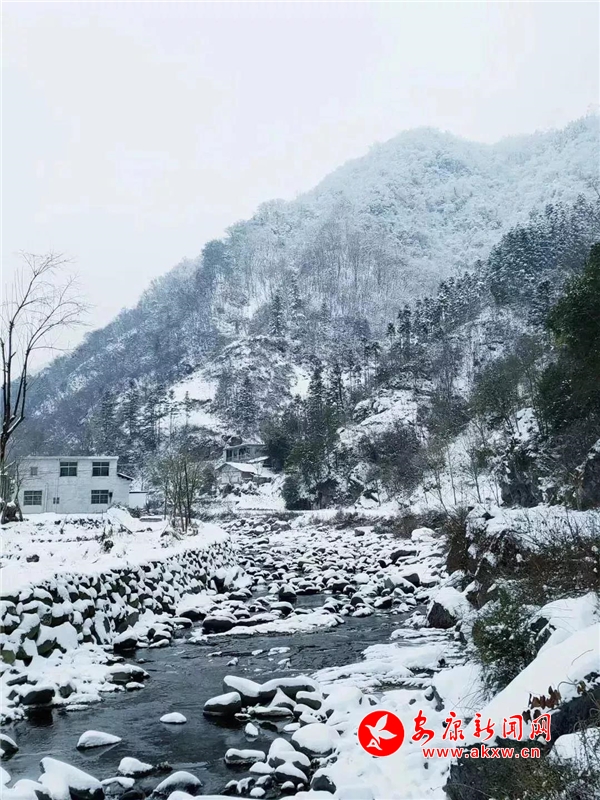 愈往深山走去,愈是銀裝素裹。發(fā)如雪,天作襯。色彩在這里失去了顏色,整個(gè)世界只剩下黑與白的構(gòu)圖。山澗中露出的黑巖,連綿著,將青絲的線條起伏蜿蜒地勾勒而出。山腳下一排排整齊的村民安置房,已顯出冬眠酣睡的樣子。樹(shù)林里帶著一層朦朧,在群山連綿中起伏著,為這雪天獻(xiàn)上了一幅絕美的水墨畫(huà)卷,也更增加了幾分神秘。