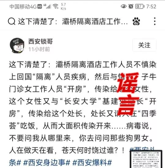 網(wǎng)上流傳一張確認(rèn)病例傳播鏈分解圖,在病例之間標(biāo)注“情人”關(guān)系,并傳言此次疫情傳播因素之一,是因?yàn)槲靼彩桌±c子牛門診的護(hù)士為情人關(guān)系,導(dǎo)致疫情擴(kuò)散,經(jīng)核實(shí),該圖盜用華商網(wǎng)12月18日制作的新聞作品圖片。該信息為虛假信息,造謠的人已被拘留。