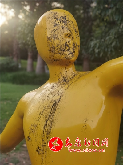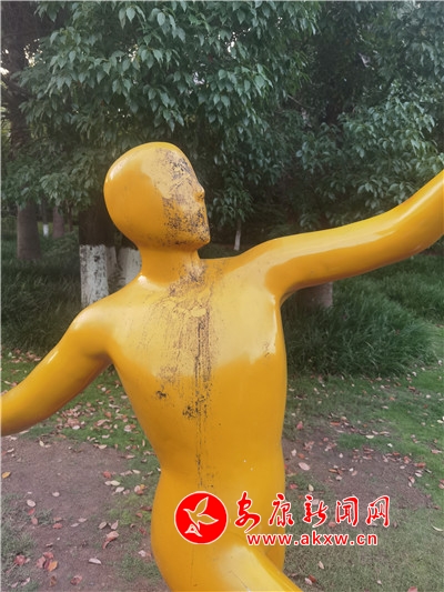 五一期間,安康高新區(qū)運動公園內(nèi),一處運動塑像遭人“抹黑”,污跡斑斑,有礙觀瞻。(記者 許安)?