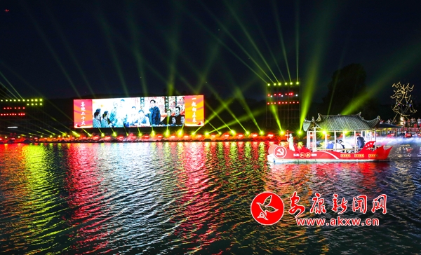 晚會在嘹亮激昂的獨唱《東方紅》中拉開序幕,緊接著,磅礴大氣的歌舞串燒《我和我的祖國》《萬疆》《愛我中華》,如詩如畫的水上表演《南湖紅船》《江南水鄉(xiāng)》《滾滾長江東逝水》,動力澎湃的RAP時尚秀《門戶新安康》,美輪美奐歌舞表演《我的深情為你守候》《為祖國干杯》《送你一個長安》《我愛你,中國》《領航》等節(jié)目相繼登臺表演,與此同時,絢麗多彩的燈光秀和仙氣飄飄的霧森特效穿插其中,不斷將演出推向高潮。最后,整場演出在大合唱《沒有共產(chǎn)黨就沒有新中國》的歌聲中圓滿落下帷幕。