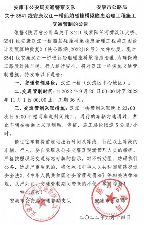 9月25日至11月1日安康漢江一橋?qū)⑦M(jìn)行船舶碰撞橋梁隱患治理工程施工,將對漢江一橋?qū)嵭?strong>交通管制36天,管制采取晚上23:00-次日5:00半幅兩車道封閉施工,通行的車輛勻速通過,禁止車輛在橋梁上采取制動、停留,施工路段限速5公里/小時。
