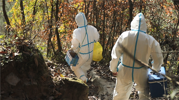 郭莉的腰間系著一個(gè)垃圾回收箱,王康提著防疫箱緊跟其后,捧著采樣管和未拆封的棉簽,一采一消,熟練地完成每一戶隔離群眾的核酸采樣。他們相互配合,收拾好消毒液等用品后,又駕車駛上蜿蜒的山道,馬不停蹄地趕往下一戶隔離群眾家中。