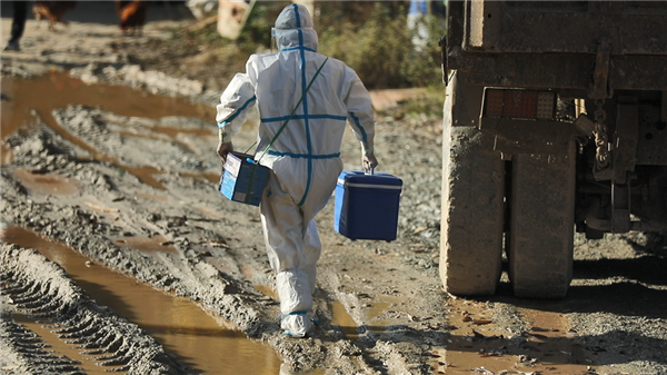 11月25日中午,忙完第一輪核酸采集,再接到流調(diào)通知單后,王康又立馬帶著他的“小伙伴”前往三里社區(qū)為居家隔離人員做核酸檢測,溝深路滑,因前幾日陰雨天氣路面濕滑,在上一處陡坡時(shí),車輪瞬間開始側(cè)滑,但是時(shí)間緊迫只能一試再試,大概試了20余次,在村上壓路車的幫助下,又試了兩次車子終于緩緩啟動(dòng)。喜悅之余他們就即刻趕往隔離群眾家中,“我們快一點(diǎn),再快一點(diǎn),就能讓等待的人少受一點(diǎn)冷”,這是“大白”們共同的心愿。