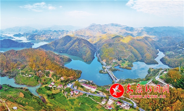 湖抱山,山擁湖,從天柱山上鳥瞰,晨看日出,霞光萬道,暮觀日落,湖光瀲滟,尤其是雨后放晴觀云海,輕煙薄霧,縹緲迷離,搖曳于峰之巔,彌漫在宇之殿,疑是凡人撞入九霄。水縹緲無垠,湖光鏡面,山綿延有致,翡翠如黛,宛如綠寶石鑲嵌。