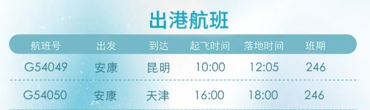 12月26日起,安康富強機場新增“安康=昆明”“安康=天津”航線。具體航線航班如圖: