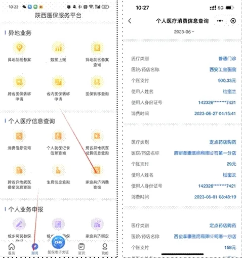 在“陜西醫(yī)保”APP“服務(wù)”界面,選擇家庭共濟(jì)消費(fèi)查詢功能,授權(quán)者可查詢到使用者的家庭共濟(jì)消費(fèi)情況。