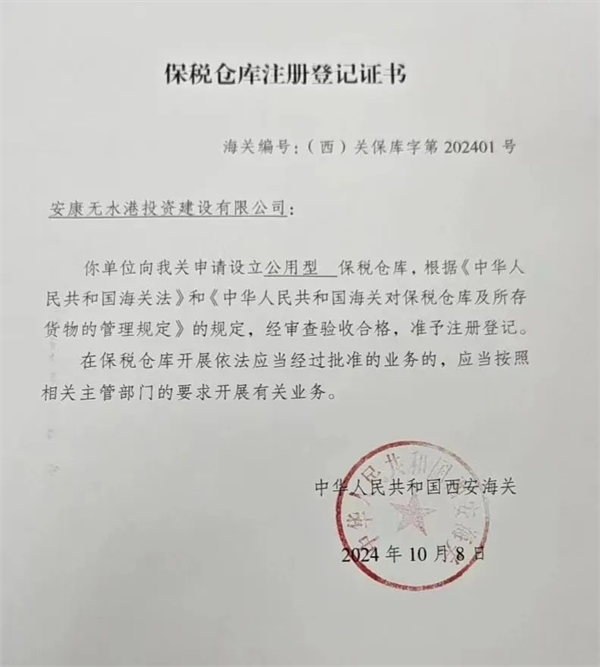 10月8日,由恒口示范區(qū)申請(qǐng)?jiān)O(shè)立的“公用型保稅倉庫”正式通過海關(guān)審查驗(yàn)收,成功獲得由西安海關(guān)頒發(fā)的《保稅倉庫注冊(cè)登記證書》,標(biāo)志著該保稅倉已具備正式運(yùn)營資質(zhì)和能力,可正式對(duì)外開展實(shí)際業(yè)務(wù)。