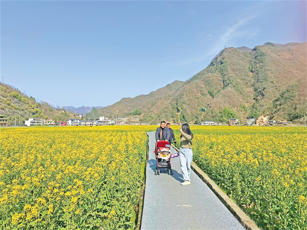 春暖花開,旬陽市仁河口鎮(zhèn)水泉坪千畝油菜花海競相綻放,慕名而來的游客們在觀光步道上觀光散步,三五伙伴一起拍照打卡、合唱民歌,欣賞高山出平川的獨(dú)特自然風(fēng)光。
