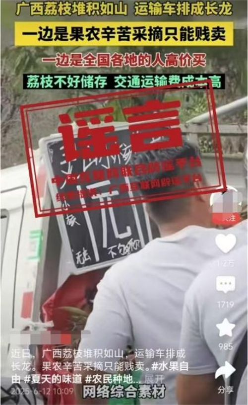 真相:6月12日,網(wǎng)傳“近日廣西荔枝堆積如山,運(yùn)輸車排成長(zhǎng)龍。果農(nóng)辛苦采摘只能賤賣”的視頻,畫面顯示荔枝堆積和“靈山荔枝1元”字樣。經(jīng)核查,視頻內(nèi)容并非發(fā)生在靈山縣。目前,靈山荔枝“妃子笑”等中熟品種逐漸批量上市,大規(guī)模上市時(shí)間為6月20日左右,當(dāng)前荔枝產(chǎn)銷有序開展,并未發(fā)現(xiàn)個(gè)別媒體報(bào)道的“荔枝滯銷賤賣”“采摘堆積成山”“運(yùn)輸車排成長(zhǎng)龍”的情況,也沒有發(fā)現(xiàn)價(jià)格低到1元的荔枝出售。(來源:“廣西互聯(lián)網(wǎng)違法和不良信息舉報(bào)”微信公眾號(hào))