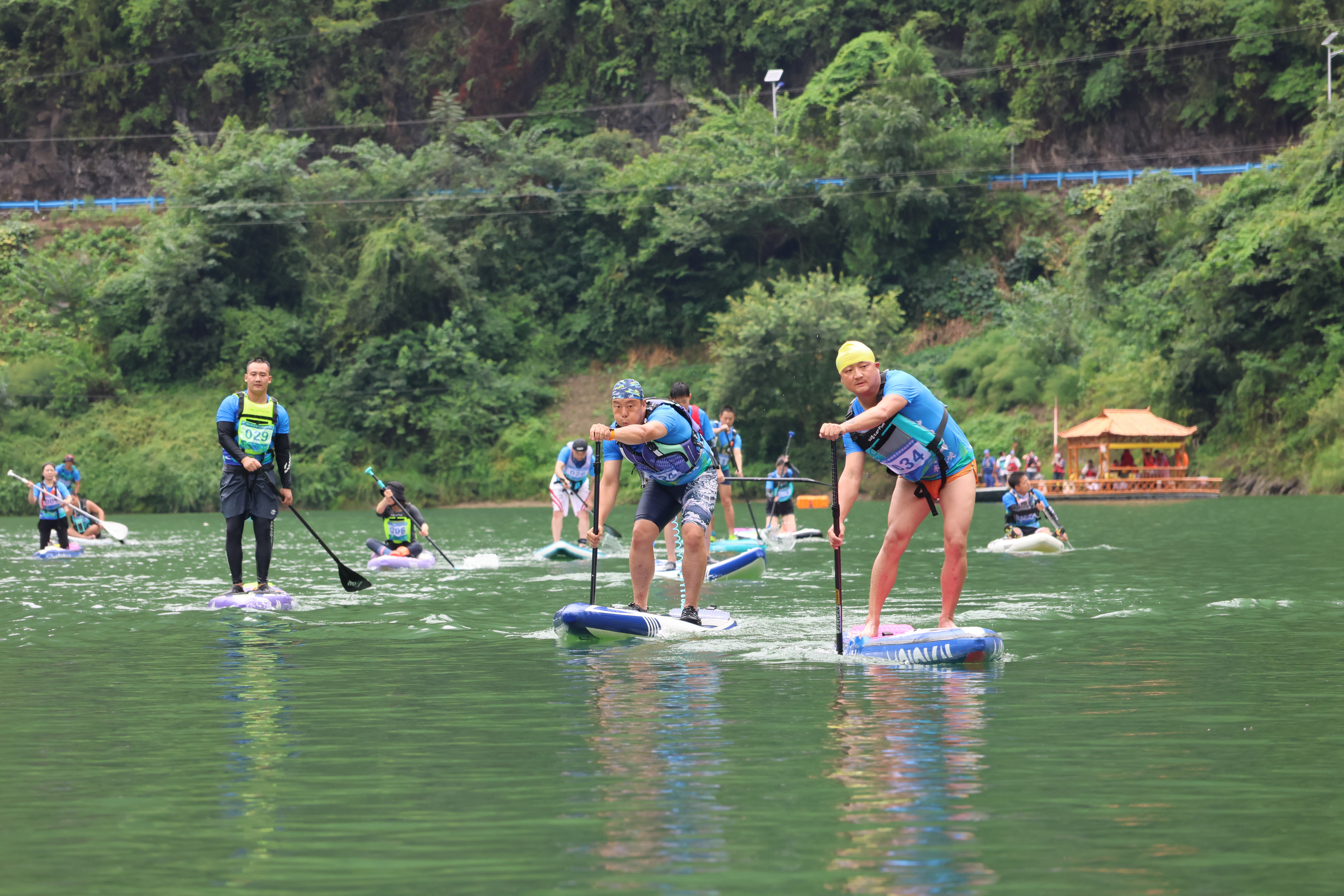 隨著發(fā)令笛聲劃破寧?kù)o,49名選手揮槳競(jìng)逐,一道道鮮艷的槳板如彩蝶點(diǎn)水,在翠谷碧波間劃出粼粼波紋,體育的活力與自然的靜謐交相輝映,賦予這片山水別樣的動(dòng)感與詩(shī)意。