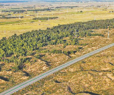 “十四五”時(shí)期,“三北”工程攻堅(jiān)戰(zhàn)取得階段性成效。圖為內(nèi)蒙古庫(kù)布其沙漠北緣鎖邊林帶。新華社記者 李志鵬攝