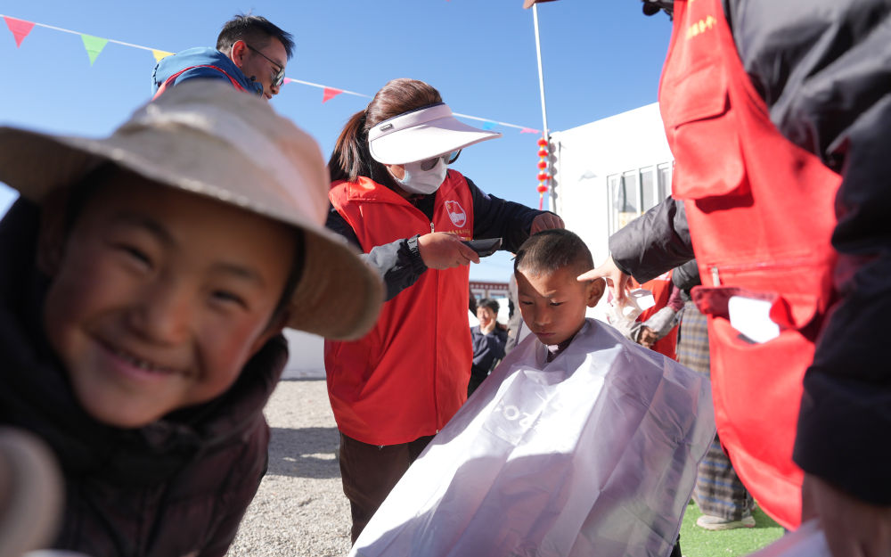 ??2025年1月26日,志愿者在西藏拉孜縣吉如村安置點為孩子們理發(fā)。西藏定日縣6.8級地震發(fā)生后,志愿者們迅速參與救援搜救、協(xié)助搭建帳篷、搬運賑濟物資、協(xié)調村民所需。數百名大學生組成志愿者服務隊,白天為安置點的孩子們輔導作業(yè)、陪孩子們運動;晚上組成巡邏隊,守護安置點的安寧。