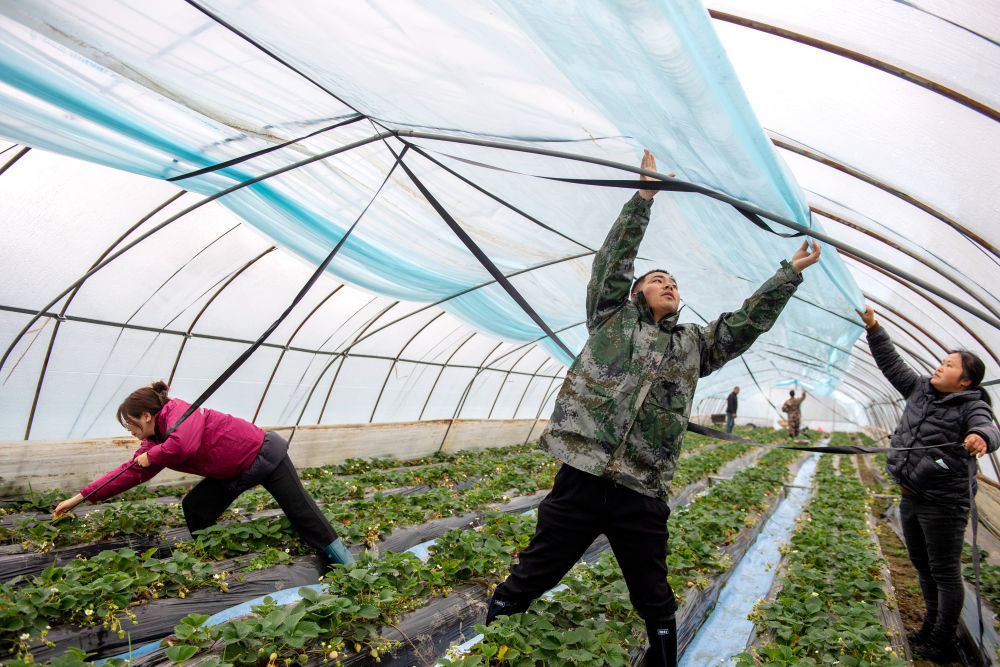 ??2023年12月15日,志愿者在浙江湖州長興縣水口鄉(xiāng)幫助農戶加蓋大棚保溫膜。為應對強雨雪天氣,志愿者們幫助農戶清理大棚上的積雪,加裝綁棚繩,棚內增設立柱,提高大棚抗風雪能力,確保農產品正常生產供應。