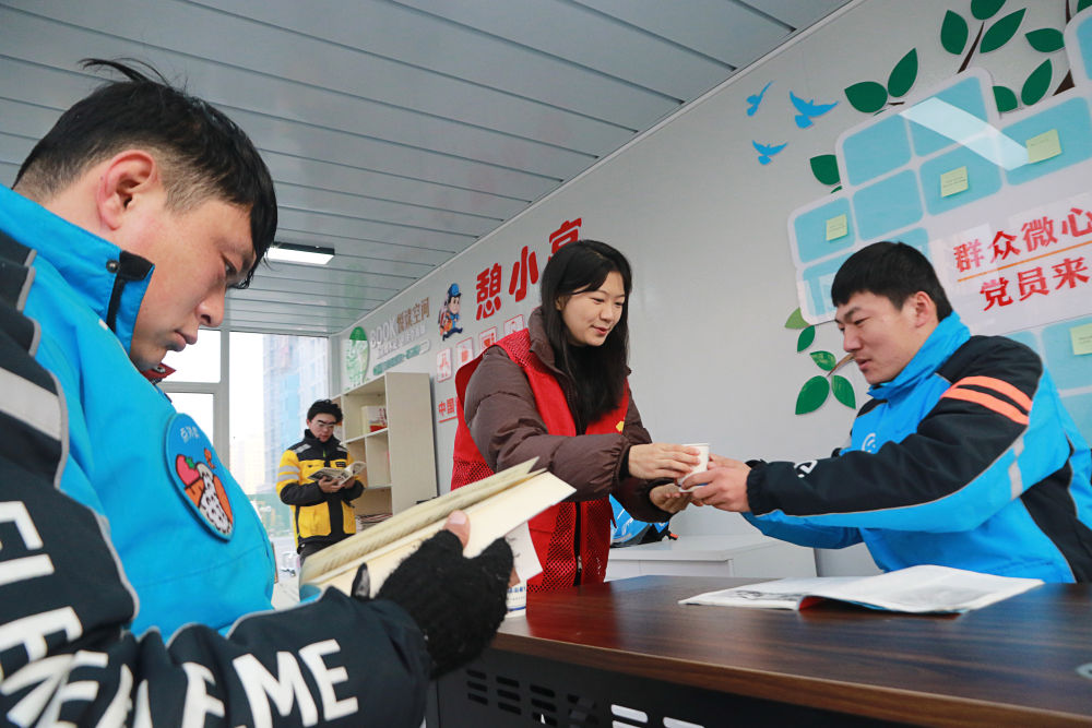 ??2023年12月27日,志愿者在山東省高密市密水街道“憩小亭”服務站為外賣騎手送上熱水。入冬以來,山東省高密市密水街道推進“憩小亭”暖心服務站建設,為外賣騎手、快遞小哥、網約車司機、環(huán)衛(wèi)工人等戶外勞動者提供飲水、無線上網、食物加熱等多項服務,讓他們感受到冬日里的溫暖。
