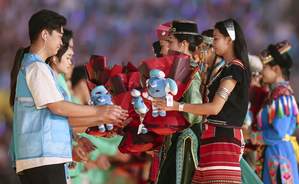 ??2024年11月30日,五十六個民族代表在海南三亞舉行的第十二屆全國少數民族傳統(tǒng)體育運動會閉幕式上為志愿者獻花。運動會期間,數千名志愿者“小鹿鹿”奔赴十余個競賽場館、二十多家接待酒店、媒體中心、機場車站等地,為來自全國各地的運動員、技術官員、工作人員和觀眾提供禮賓接待、交通引導、安全保衛(wèi)等志愿服務。
