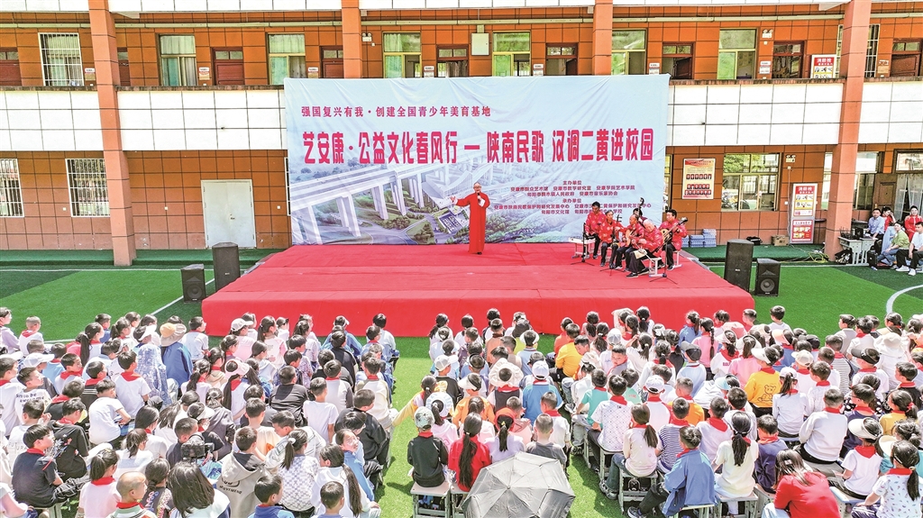 展演現(xiàn)場,紫陽小學(xué)學(xué)生帶來的民歌聯(lián)唱《童聲唱紫陽》贏得滿堂喝彩。孩子們用清亮的嗓音演繹《開山歌》《三月三上茶山》《螃蟹歌》等經(jīng)典陜南民歌,悠揚婉轉(zhuǎn)的旋律中透著童真童趣,將地域文化的獨特韻味展現(xiàn)得淋漓盡致。“這首歌是奶奶教我唱的,現(xiàn)在我在學(xué)校社團里學(xué)會了更多唱法?!敝鞒獙W(xué)生鄧可唯說,通過美育課程,她不僅學(xué)會了唱歌,還了解了民歌背后的民俗故事。