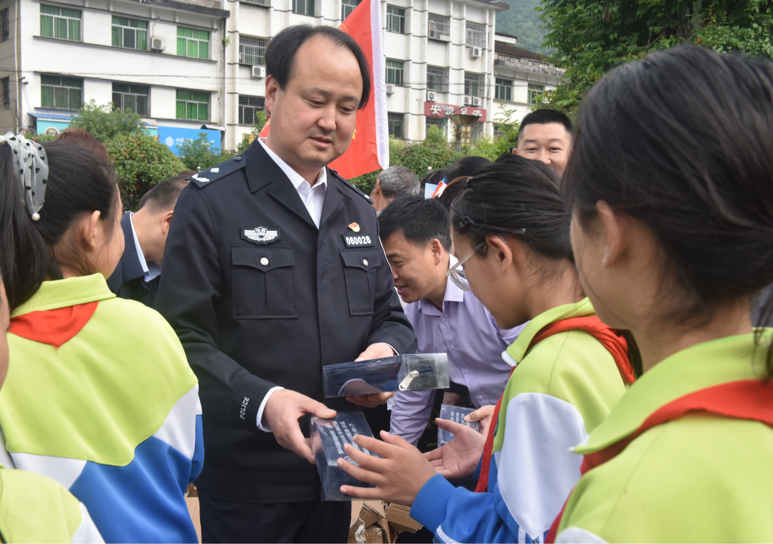 △ 民警向?qū)W生發(fā)放宣傳用品