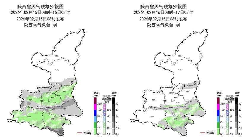 雨雪過(guò)程期間陜北南部、關(guān)中北部、秦巴山區(qū)小到中雪或雨夾雪(0.1~5毫米),關(guān)中南部、陜南為雨夾雪或小雨(0.1~5毫米),陜南南部局地有中雨(10~15毫米);雨雪落區(qū)2月15日在陜北南部、關(guān)中、陜南,16 日(除夕)至17日(初一)在陜南。受雨雪影響,2月15日夜間至16日(除夕)清晨全省大部能見(jiàn)度較低,秦巴山區(qū)局地有大霧。2月14日至15日和21日(初五)全省大部有4~5級(jí)(5.5~10.7米/秒)偏北風(fēng),陣風(fēng)6~7級(jí)(10.8~17.1米/秒),其中2月21日(初五)中北部部分地方伴有揚(yáng)沙或浮塵。兩次降溫均屬于中等強(qiáng)度,日平均氣溫全省大部下降4~6℃,陜北北部、秦嶺山區(qū)下降6~8℃。