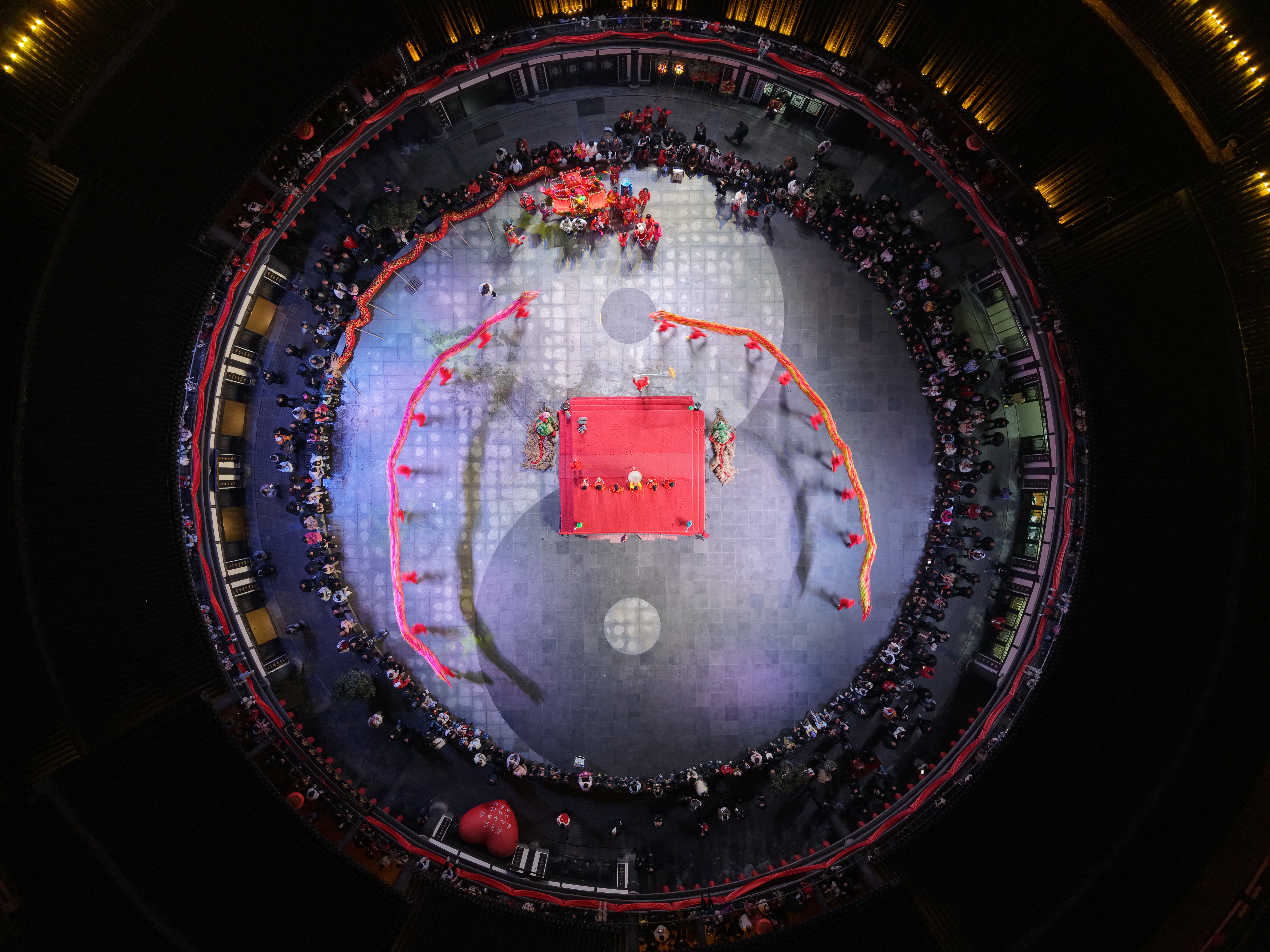 如果說(shuō)老街的巡游充滿了市井的煙火氣,那么在秦巴風(fēng)情園內(nèi),非遺民俗表演則將這里的氣氛推向了高潮。夜幕降臨,風(fēng)情園廣場(chǎng)上早已人山人海。隨著鏗鏘的鑼鼓聲,巨龍穿梭起舞,龍身翻轉(zhuǎn)騰挪,場(chǎng)面熱烈。
