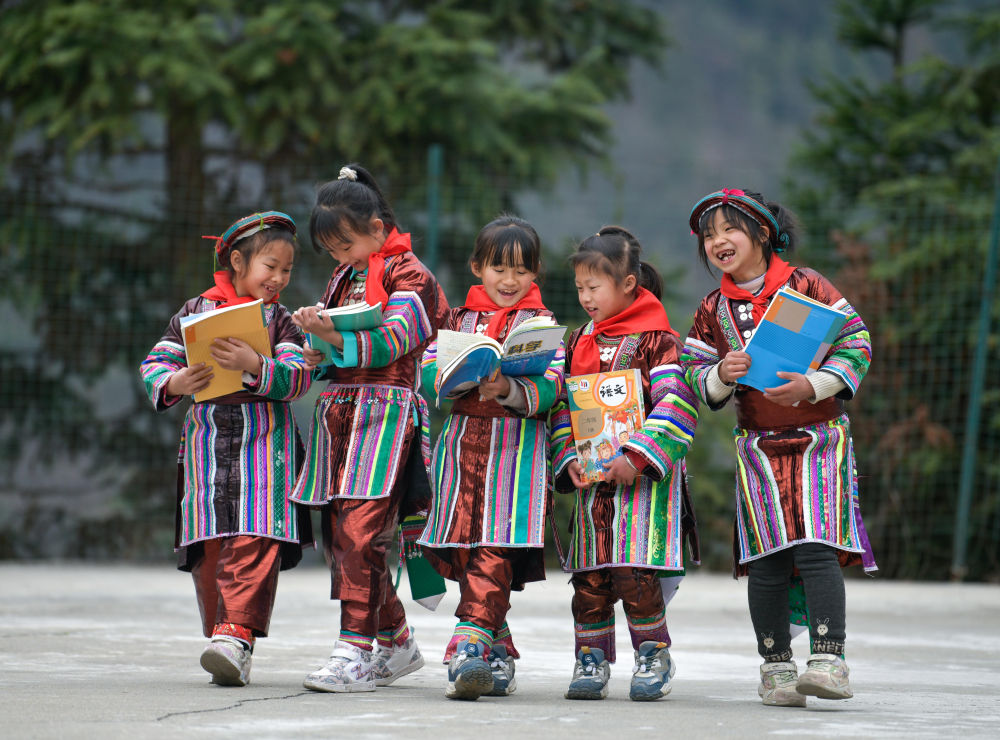 2023年2月16日,在貴州省從江縣西山鎮(zhèn)中寨教學(xué)點(diǎn),領(lǐng)到新書(shū)的瑤族學(xué)生在一起交流。新華社記者楊文斌攝