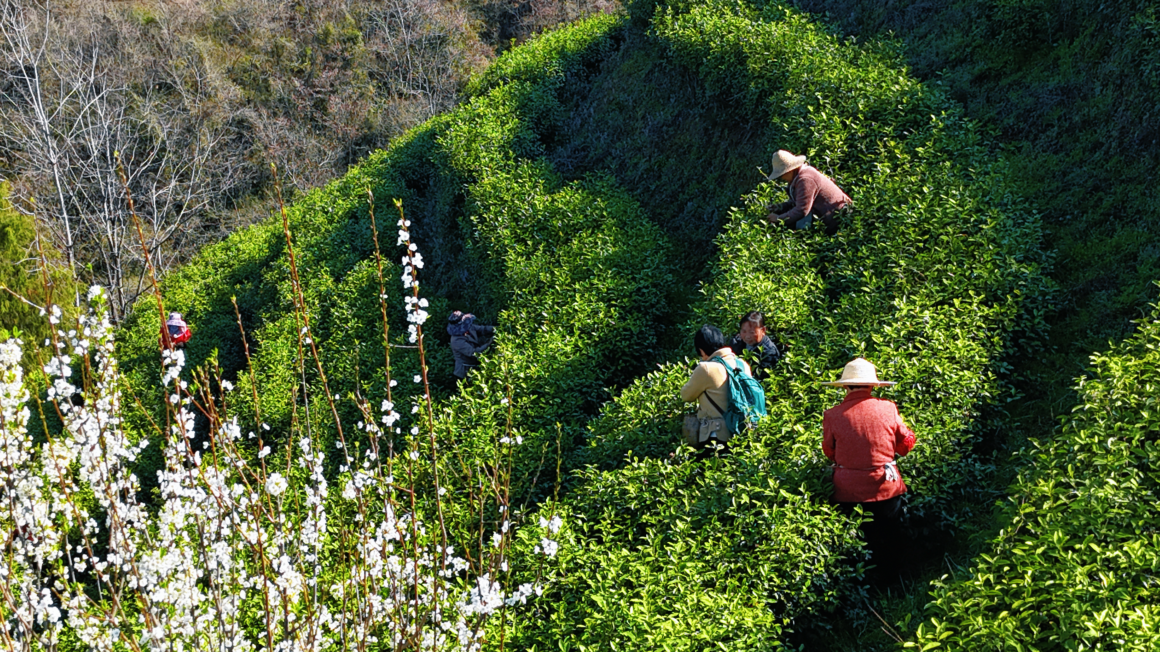 茶農(nóng)在茶壟采摘頭茬春茶