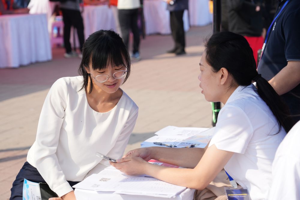 2024年9月25日,求職者(左)在招聘會(huì)現(xiàn)場(chǎng)與招聘單位工作人員交流。當(dāng)日,雄安新區(qū)舉辦2024年河北省畢業(yè)生就業(yè)市場(chǎng)雄安新區(qū)專場(chǎng)招聘會(huì)暨河北雄安新區(qū)大型人力資源招聘會(huì)。招聘會(huì)以“穩(wěn)崗就業(yè) 聚才發(fā)展”為主題,邀請(qǐng)京津冀地區(qū)共157家企業(yè)線下參會(huì),提供就業(yè)崗位4783個(gè)。