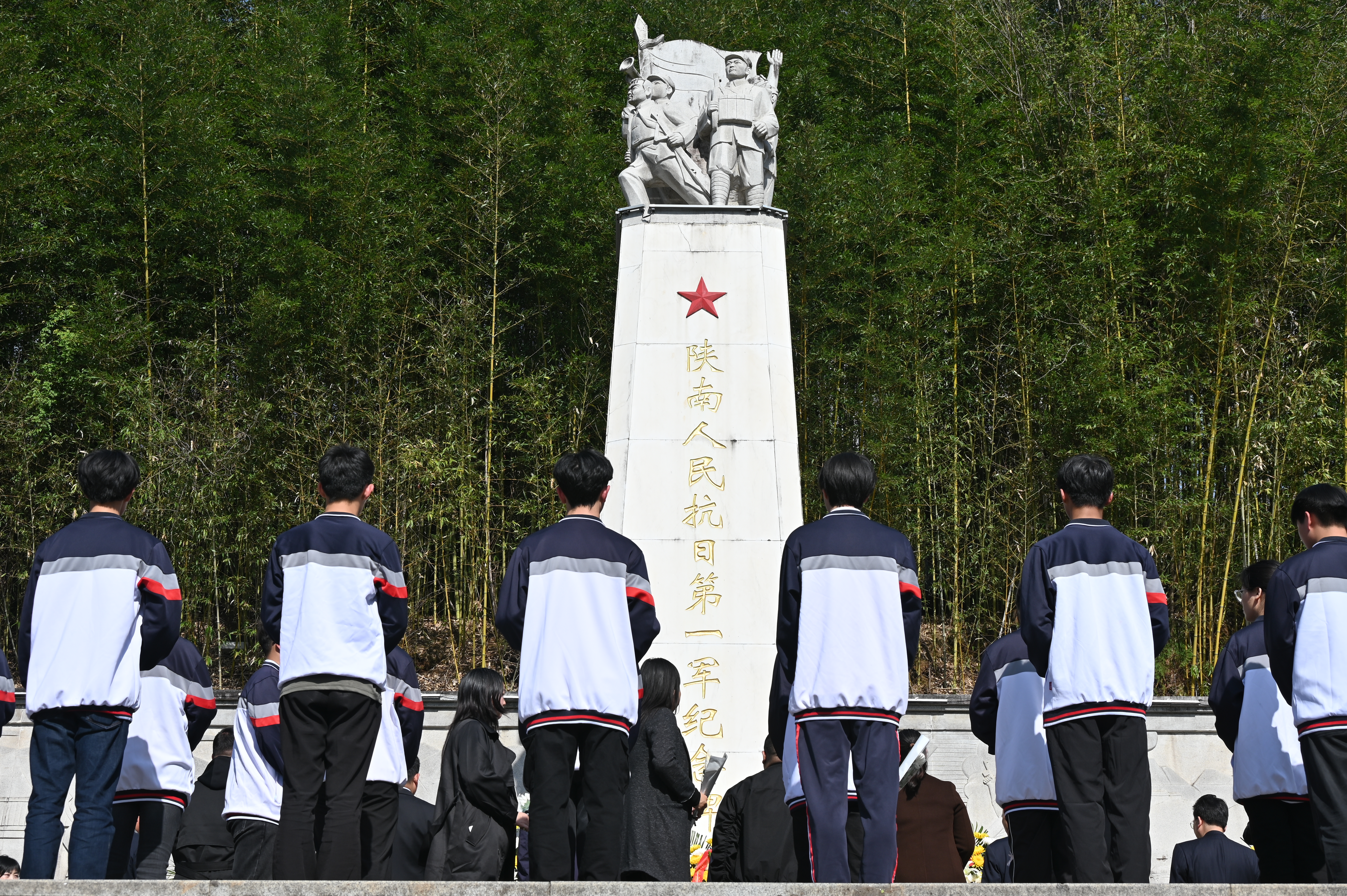 3月31日,安康職業(yè)技術(shù)學(xué)院組織師生赴漢陰縣開展“漢陰尋跡、致敬英烈”活動,參觀了漢陰縣沈啟賢將軍故居、楊棄將軍紀(jì)念館。圖為陜南人民抗日第一軍紀(jì)念廣場,師生代表敬獻花籃。 張智明 攝