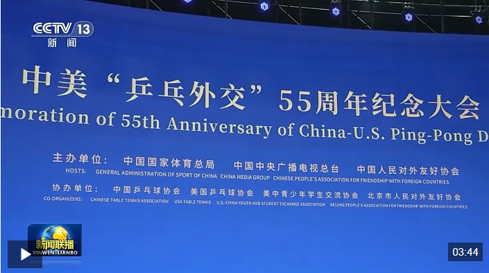 4月10日,習(xí)近平主席向中美“乒乓外交”55周年紀(jì)念大會暨中美青少年體育交流系列活動啟動儀式致賀信,高度評價“乒乓外交”的歷史和現(xiàn)實(shí)意義,鼓勵兩國各界人士特別是青年一代相知相親、攜手前行,為兩國關(guān)系注入強(qiáng)大動力和溫暖能量。習(xí)近平主席的賀信在中美各界人士中引發(fā)熱烈反響。