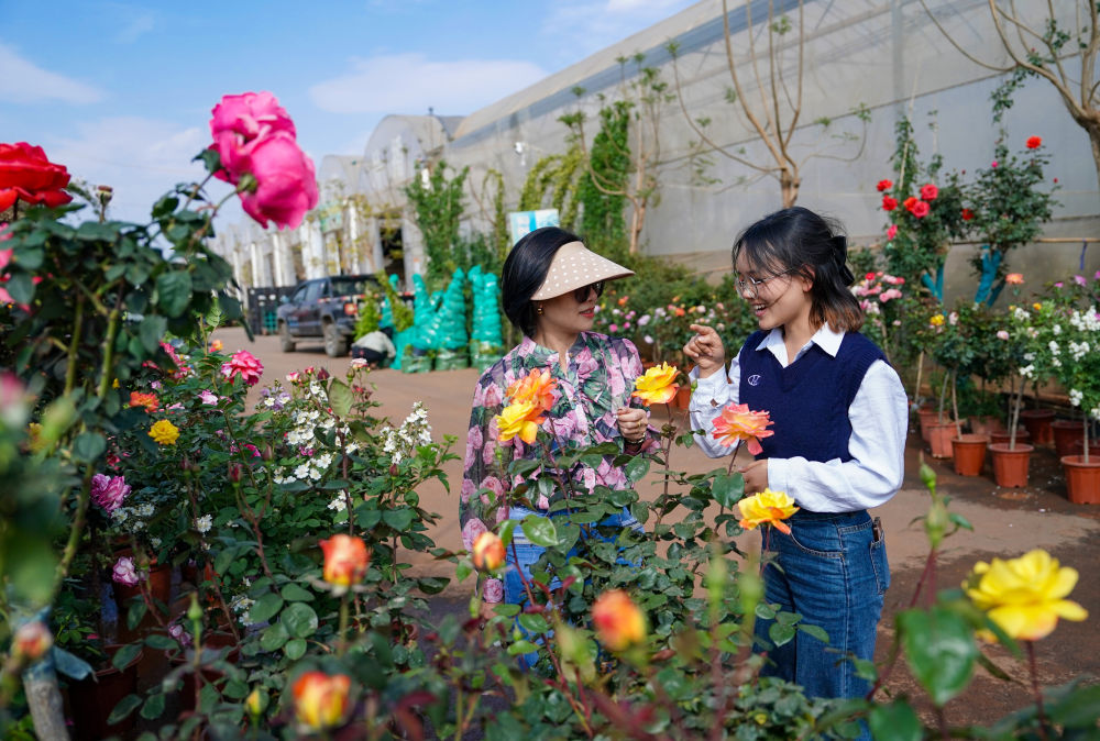 2025年4月11日,越南花商阮翠云(左)與翻譯李青歌在云南昆明斗南一花卉基地內(nèi)查看鮮花品質(zhì)。2018年,阮翠云開始在越南銷售云南花卉,讓七彩“云花”成為眾多越南家庭的“??汀薄=柚咝У碾娚唐脚_和快捷的物流網(wǎng)絡(luò),鮮花從云南花田到河內(nèi)貨架實現(xiàn)了“次日達”。