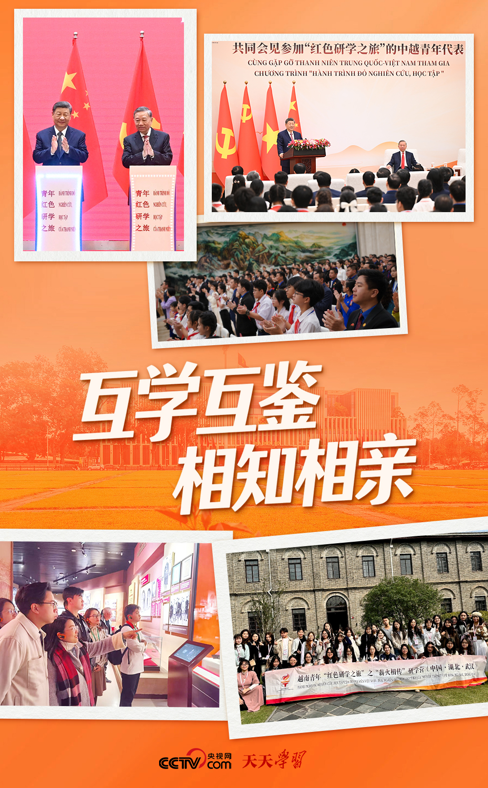 2025年4月15日,習(xí)近平總書記在訪問(wèn)越南期間宣布,中方將在今后3年邀請(qǐng)?jiān)侥锨嗄旮叭A開展“紅色研學(xué)之旅”,沿著兩黨兩國(guó)老一輩領(lǐng)導(dǎo)人的革命足跡,探尋中越友好的紅色基因,感受中國(guó)式現(xiàn)代化的萬(wàn)千氣象,為兩國(guó)各自社會(huì)主義事業(yè)和構(gòu)建具有戰(zhàn)略意義的中越命運(yùn)共同體凝聚青春力量。當(dāng)日,中越兩黨兩國(guó)領(lǐng)導(dǎo)人與雙方代表共同按下按鈕,啟動(dòng)“紅色研學(xué)之旅”項(xiàng)目,為兩國(guó)青年搭建起跨越國(guó)界、聯(lián)結(jié)初心的友誼橋梁。