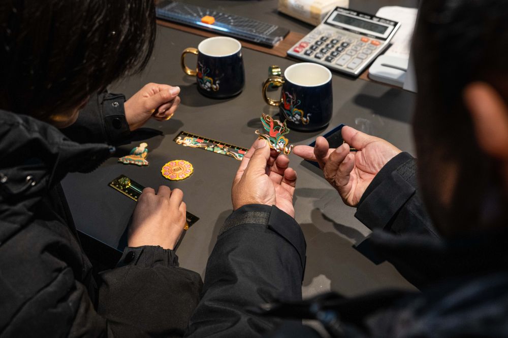 2026年1月15日,云南麗江白沙壁畫博物館館長(zhǎng)楊志堅(jiān)(右)與同事討論文創(chuàng)產(chǎn)品設(shè)計(jì)。近年來(lái),白沙壁畫博物館持續(xù)推動(dòng)白沙壁畫赴廣東、上海等地展覽,主持編纂畫冊(cè),并推進(jìn)數(shù)字化采集和文創(chuàng)開發(fā),讓壁畫藝術(shù)以新的形式走進(jìn)人們的日常生活。