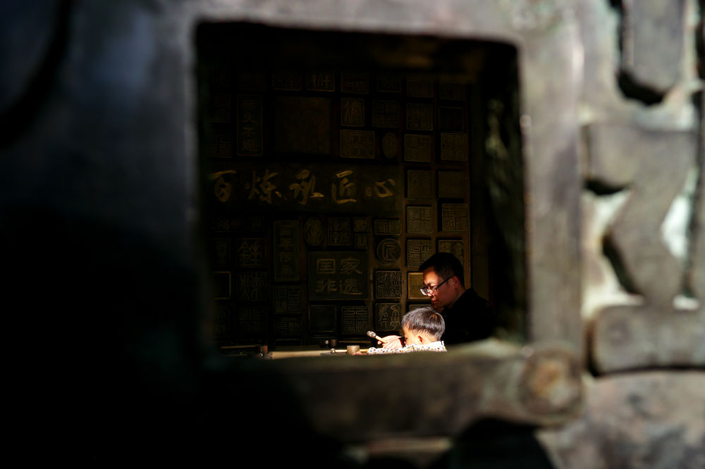 2026年3月25日,在云南曲靖會(huì)澤縣國(guó)家級(jí)非遺斑銅制作技藝傳習(xí)館,張氏斑銅第十三代傳人張偉在教兒子敲打銅器。會(huì)澤以“保護(hù)優(yōu)先、匠心修復(fù)、多元活化、融合共生”為路徑推進(jìn)古城活化保護(hù),對(duì)會(huì)館、民居等古建筑匠心修繕、活化利用,同時(shí)保留居民生活業(yè)態(tài),常態(tài)開展特色文化活動(dòng),用微改造提升古城環(huán)境。