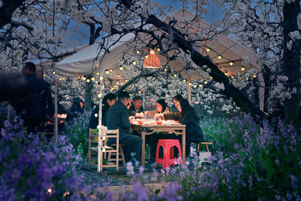 2026年3月30日,游客在安徽省宿州市碭山縣梨小萌歡樂梨園品嘗梨園火鍋。新華社發(fā)(崔猛 攝)