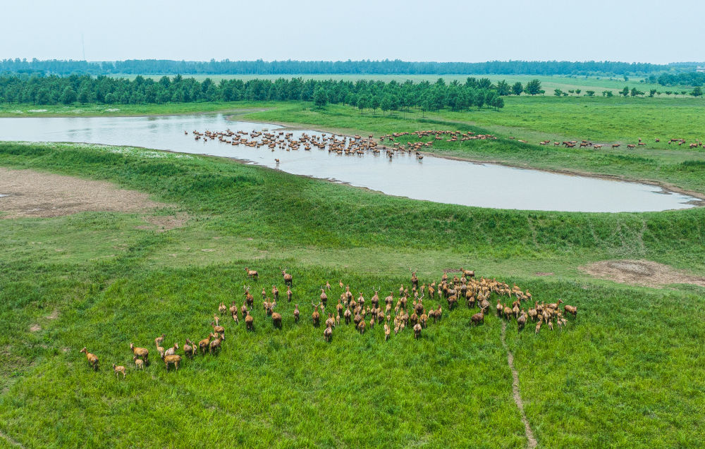 2023年5月19日,麋鹿在湖北石首麋鹿國家級自然保護(hù)區(qū)內(nèi)活動(無人機(jī)照片)。伴隨生態(tài)環(huán)境改善,在湖北石首麋鹿國家級自然保護(hù)區(qū)、神農(nóng)架林區(qū)等多個生態(tài)屏障區(qū),麋鹿、金絲猴等野生動物種群數(shù)量大幅增長。