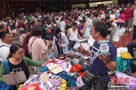 9月15日,天意商戶舉起二維碼方便顧客掃碼支付,以新式支付方式助力傳統(tǒng)零售。當(dāng)日,自1992年開業(yè)至今的北京天意市場迎來其在北京西城阜外大街營業(yè)的最后一日,商家趁機(jī)“瘋狂甩貨”,大批北京民眾也紛至沓來。這里曾是北京著名的小商品商城,聚集了數(shù)千家商戶。為疏解北京非首都功能,天意商城將于本月16日關(guān)門停業(yè)。中新社記者 崔楠 攝JgP安康新聞網(wǎng)