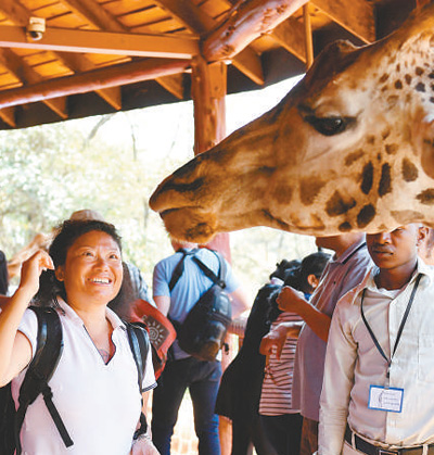 近年來,春節(jié)期間前往非洲旅游的中國游客逐漸增多。今年春節(jié)期間,在肯尼亞首都內(nèi)羅畢的長頸鹿中心,一名中國游客和長頸鹿互動。J2n安康新聞網(wǎng)