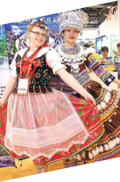 在2017北京國際旅游博覽會上,來自波蘭的安娜(左)和來自廣西柳州市融水苗族自治縣的張鳳媚合影留念。J2n安康新聞網(wǎng)