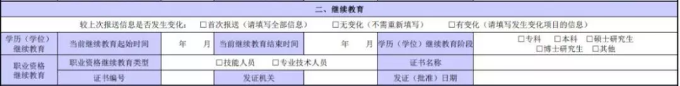繼續(xù)教育一欄中,除了基本信息的填寫,同樣是在有方格的地方進(jìn)行對(duì)應(yīng)框內(nèi)打“√”。