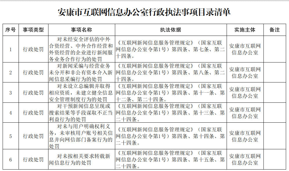 安康市互聯(lián)網(wǎng)信息辦公室行政執(zhí)法事項目錄清單