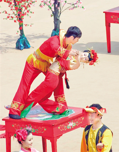 安康小場子不同于東北二人轉(zhuǎn),有著獨特的藝術(shù)風格。一男一女也即是一丑一旦兩角兒,在不到一平方米的八仙桌上,伴和著清脆響亮的鑼鼓聲演繹著獨屬于安康的特色,無論說唱,音調(diào)抑揚頓挫、清脆婉轉(zhuǎn)。