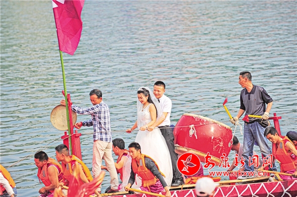 2017年,第十七屆安康龍舟節(jié)開(kāi)幕式上的水上婚禮。 林江 攝
