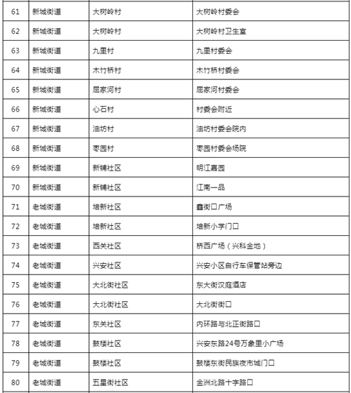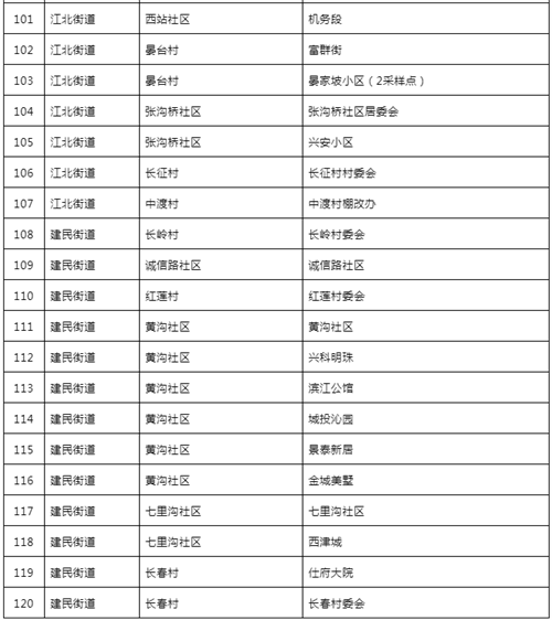 共設(shè)置120個采樣點(見附件),由4個街道辦事處統(tǒng)一安排采樣點設(shè)置、人員組織、秩序維護(hù),檢測對象按照街道辦事處要求,分時段有序到指定地點進(jìn)行采樣,避免人員聚集。