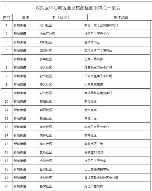 附件:漢濱區(qū)中心城區(qū)全員核酸檢測采樣點一覽表