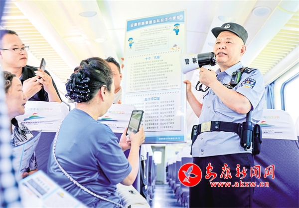 “我已經(jīng)發(fā)展了三個(gè)志愿者!”老范一邊興高采烈地說著,一邊從他的工作包中找出志愿者袖標(biāo)及徽章。就在剛才,在站臺(tái)上引導(dǎo)旅客上車的老范憑著自己的親和力,很快就物色了幾名自愿擔(dān)任平安列車志愿者的旅客。老范隨后給志愿者佩戴袖標(biāo)及徽章,給他們開展崗前培訓(xùn),帶他們在列車上開展反詐和防盜等安全宣傳。