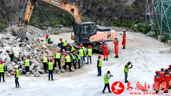 啟動(dòng)儀式上,漢陰縣介紹安全宣傳及應(yīng)急演練情況,市安委辦對(duì)全市安全生產(chǎn)月活動(dòng)再安排再部署。隨后,開展了非煤礦山事故應(yīng)急演練。演練模擬持續(xù)強(qiáng)降雨天氣下,漢陰西鐵義德石料有限公司廠區(qū)出現(xiàn)邊坡坍塌導(dǎo)致人員、設(shè)備被掩埋險(xiǎn)情,市、縣、鎮(zhèn)、企業(yè)四級(jí)應(yīng)急救援隊(duì)伍緊急出動(dòng),展開聯(lián)合搶險(xiǎn)救援。演練過程中,各小組緊密配合,順利完成了應(yīng)急響應(yīng)、警戒疏散、交通管制、信息上報(bào)、企業(yè)自救、傷員救治、雷達(dá)生命探測(cè)儀救援、無人機(jī)運(yùn)輸物資等演練科目,模擬險(xiǎn)情得到及時(shí)消除。本次演練場(chǎng)景逼真,貼近實(shí)戰(zhàn),實(shí)現(xiàn)了鍛煉隊(duì)伍、磨合機(jī)制,強(qiáng)化應(yīng)急處置能力的目標(biāo),無人機(jī)、生命探測(cè)儀等新技術(shù)裝備的運(yùn)用,有效提升礦山應(yīng)急救援能力。