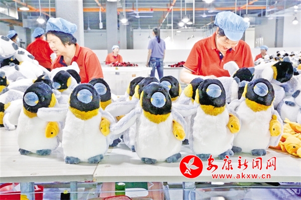 偉高玩具制造有限公司四樓的車間內(nèi),手縫區(qū)的工人進行企鵝玩具縫制作業(yè),工廠里呈現(xiàn)一派繁忙景象。