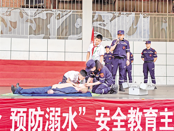 漢江志愿者救生隊進學校開展防溺水知識演練。鄭時根 攝