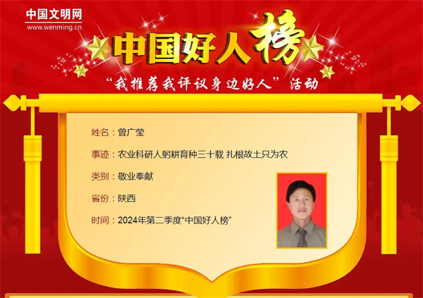 曾廣瑩,男,1966年10月生,中共黨員,陜西省鎮(zhèn)坪縣農(nóng)業(yè)科學(xué)研究所黨支部書記、副所長(zhǎng)。曾廣瑩30年如一日行走于田間地頭,兢兢業(yè)業(yè)從事農(nóng)業(yè)示范研究和推廣工作,完成多個(gè)玉米新品種審定與大面積推廣,填補(bǔ)了中高山玉米品種空白,為秦巴地區(qū)糧食安全和玉米品種繁育作出了突出貢獻(xiàn)。曾廣瑩曾獲“農(nóng)業(yè)部全國(guó)農(nóng)牧漁業(yè)豐收獎(jiǎng)(農(nóng)業(yè)技術(shù)推廣貢獻(xiàn)獎(jiǎng))”“陜西省優(yōu)秀共產(chǎn)黨員”“陜西好人”等榮譽(yù)。