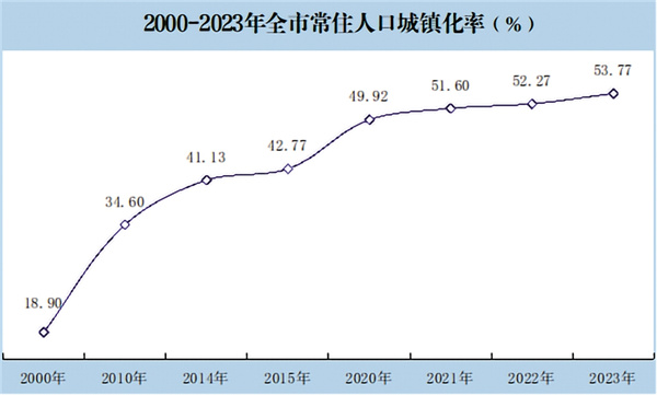 城鎮(zhèn)化步伐明顯加快。1949年,安康總?cè)丝?46.75萬人,其中農(nóng)業(yè)人口占89.4%,屬于典型傳統(tǒng)的農(nóng)村社會,交通不便,人員相對封閉不流動。改革開放后,市場經(jīng)濟體制逐步建立,特別是2000年撤地設市,對安康具有劃時代和里程碑的意義。2021年旬陽撤縣設市,成為陜南首個縣級市,標志著全市城鎮(zhèn)化步伐邁向更高水平。全市抓住東部勞動密集型產(chǎn)業(yè)向中西部轉(zhuǎn)移的機遇,依托易地搬遷集中安置點,大力興辦新社區(qū)工廠,把農(nóng)民變?yōu)榫用,大力開展新環(huán)境、新服務、新產(chǎn)業(yè)、新民風、新生活“五新”社區(qū)創(chuàng)建工作,完善配套設施,健全服務體系,城鎮(zhèn)化建設步伐顯著加快。2023年,全市戶籍人口300.75萬人,常住人口245.72萬人。常住人口城鎮(zhèn)化率由2000年的18.9%,提高到2023年的53.77%,23年間提高了34.87個百分點。