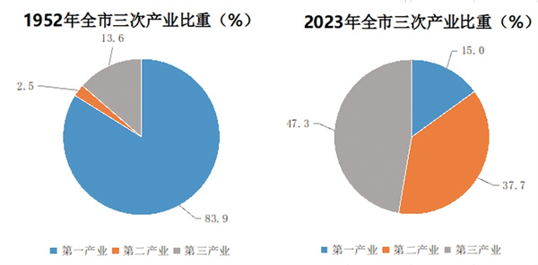 產(chǎn)業(yè)結(jié)構(gòu)日趨優(yōu)化。1952年,全市三次產(chǎn)業(yè)比為83.9︰2.5︰13.6,產(chǎn)業(yè)結(jié)構(gòu)呈“一、三、二”模式,為典型的農(nóng)業(yè)市,隨著工業(yè)經(jīng)濟和第三產(chǎn)業(yè)的不斷發(fā)展,全市第一產(chǎn)業(yè)比重逐年下降,二、三產(chǎn)業(yè)比重逐年上升,2012年三次產(chǎn)業(yè)比為19.4︰42.7︰37.9,第一產(chǎn)業(yè)占比首次低于20.0%,第二產(chǎn)業(yè)突破40.0%,產(chǎn)業(yè)結(jié)構(gòu)呈“二、三、一”模式;隨著第三產(chǎn)業(yè)不斷壯大,2020年占比45.3%,躍居三產(chǎn)之首,呈“三、二、一”模式,并連續(xù)保持4年,2023年全市三次產(chǎn)業(yè)之比15.0︰37.7︰47.3,以服務業(yè)為主的產(chǎn)業(yè)結(jié)構(gòu)加速形成。
